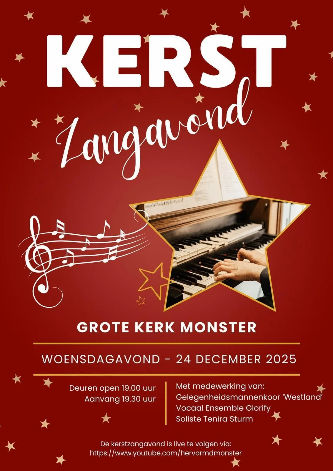 Kerstzangavond in de Grote Kerk van Monster. Op de avond voor het kerstfeest, 24 december, is er zoals gebruikelijk weer een Kerstzangavond in de Grote kerk van Monster. Welkom!